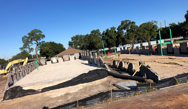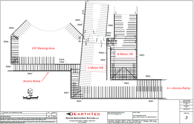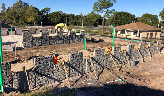 Rather than repair the MSEWs, the City of Oldsmar elected to completely demolish and replace the start hills and VIP Viewing Area using the Design-Build delivery method. GIS in combination with the Design-Build design team elected to use an MSE with a segmental concrete panel totaling 12,500 square feet.