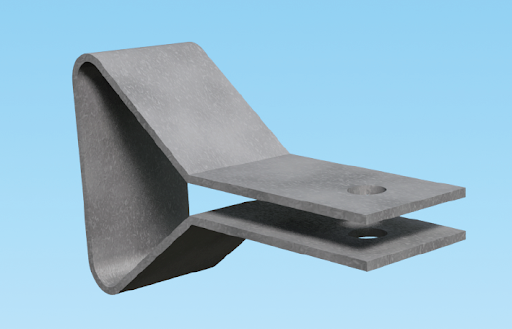 The panel anchor consists of a special shaped A1011 Grade 50 steel plate that is 2” in width with a thickness equal to 0.135”. The anchor is fabricated so there are two ends of the plate that are parallel and offset from one another by a distance of 1/2”. Each end of the plate has a 9/16” diameter centralized bolt hole punched in it. The parallel plates are fabricated into a flared, triangular configuration.