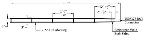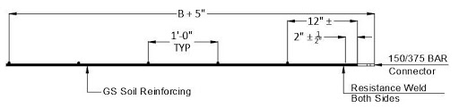 The Vistawall utilizes the Grid-Strip® soil reinforcing element. The Grid-Strip® is manufactured from cold drawn wire. The lead end of the Grid-Strip® is resistance welded to a flat plate connector called the BAR connector. The BAR connector is fabricated from steel plate and is 1.5” wide x 5” long with the terminal end having cold-formed serrated edges. These serrations are used to seat the longitudinal wires of the Grid-Strip® soil reinforcing at the location of the resistance weld. The lead ends of the longitudinal wires of the Grid-Strip® are resistance welded to the terminal end of the BAR at the location of the serrations. The resistance weld length is specified to be a minimum of 1” in length.